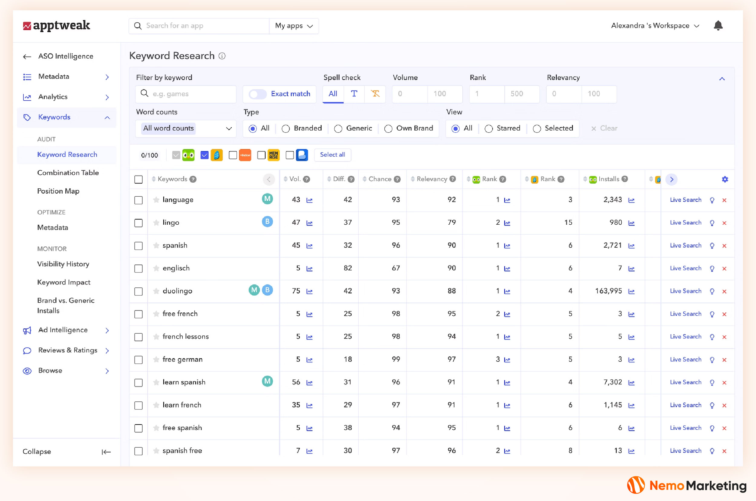 Nemo Marketing has a guide on Keyword Research on Apptweak in this article, feel free to check it out.