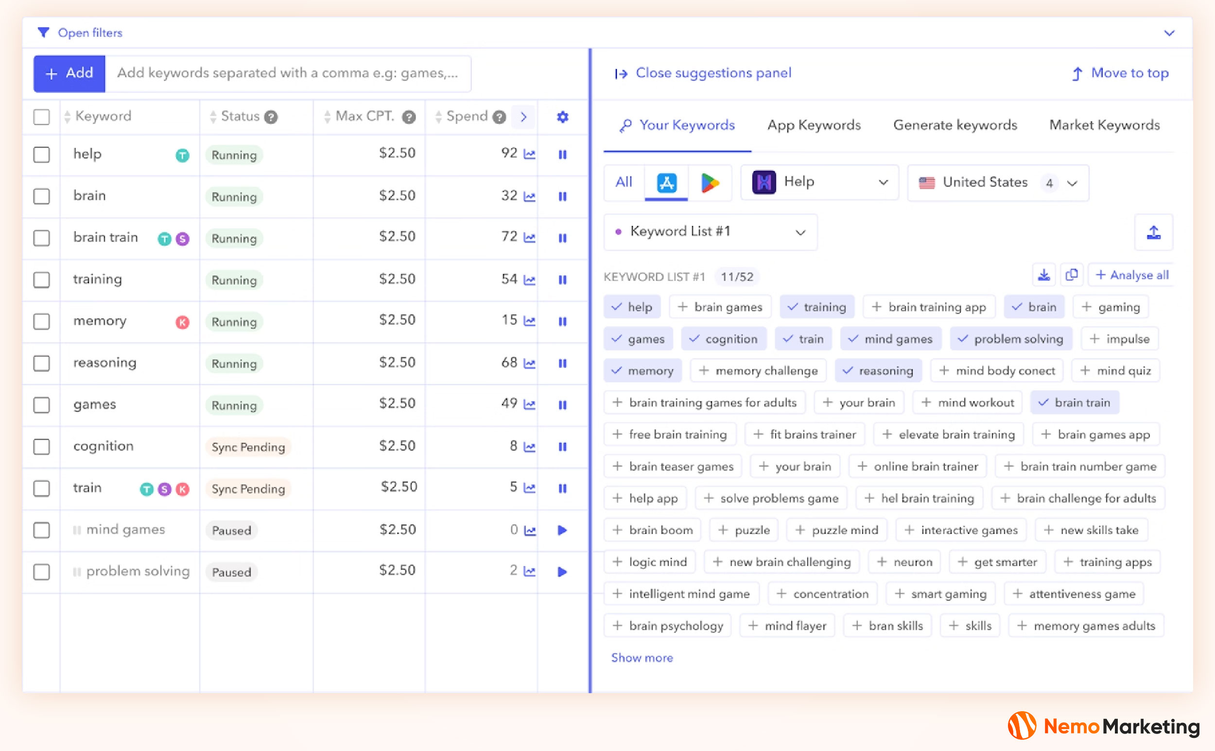 Researching keywords for Apple Search Ads is quite similar to ASO; however, you can also consider additional metrics such as Cost per Tap (CPT). Moreover, Apptweak allows you to integrate directly with your Apple Search Ads account for performance tracking and optimization directly on this platform.