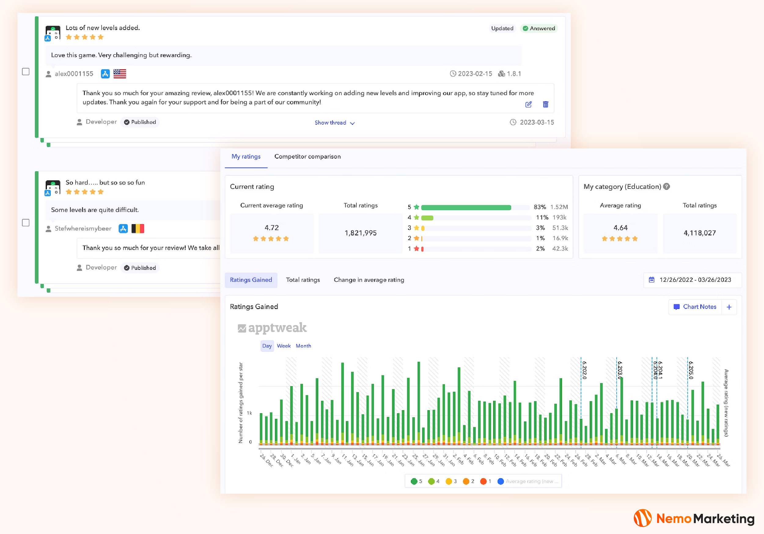 However, it’s worth introducing to you a similar feature on AppTweak. It consolidates all customer review information, such as the number of ratings, star ratings, and detailed review content.