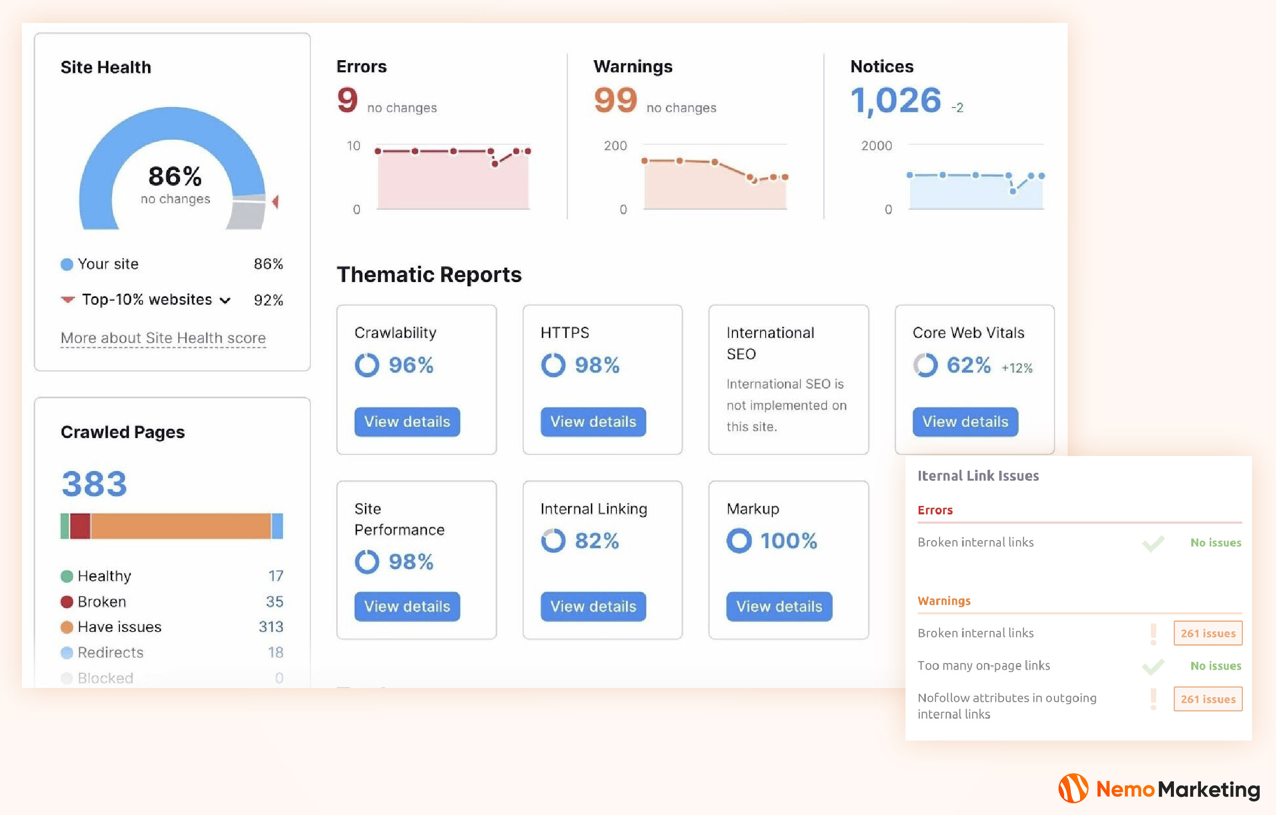 For instance, when we noticed increases in Error and Warning indicators, the SEO Specialists would “View details” to explore and resolve the issue. SEMRush breaks down each issue for you in detail.